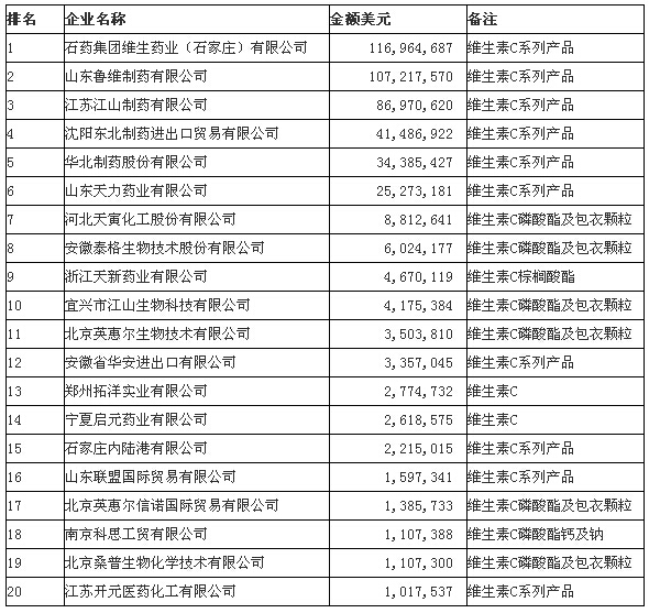 2014年維生素c出口二十強(qiáng)企業(yè)